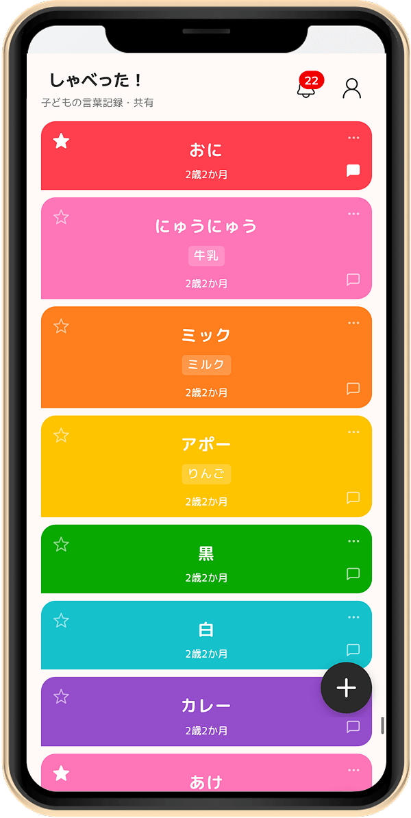 記録した言葉は、カラフルで可愛いカード形式に。意味や月齢も表示され、成長を楽しく振り返れます。